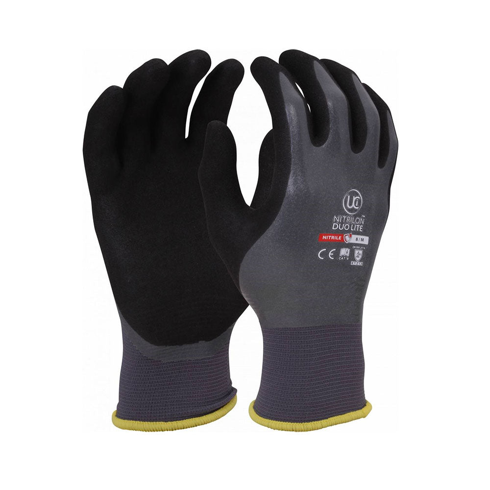 A premium fully coated Nitrile glove with additional second sandy nitrile coating to the palm for increased grip and protection in wet and oily situations.An incredibly soft grey 18gg seamless nylon liner increases wearer comfort.Anatomically shaped to further reduce hand fatigue.Hardwearing glove with good resistance to abrasion.Offers an excellent barrier to oils and greases.